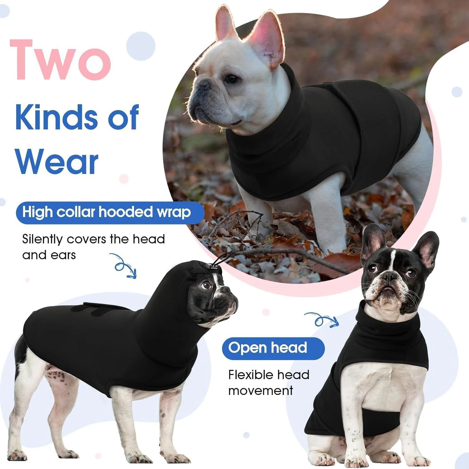 The dog calming vest is a polyester hooded garment with adjustable drawstring cord lock and hook-and-loop fasteners that provides head and full body coverage, available in XS to XL sizes matched to specific dog breeds and designed for bulk wholesale procurement.