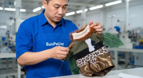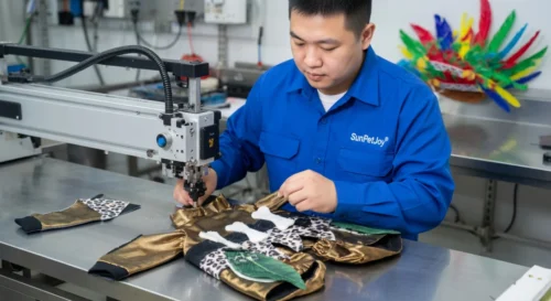 This is our computerized sewing stage where seams are precisely stitched to assemble the army green body of the pet dog sweater. Our skilled operators maintain strict quality control for dependable wholesale consistency and durability.