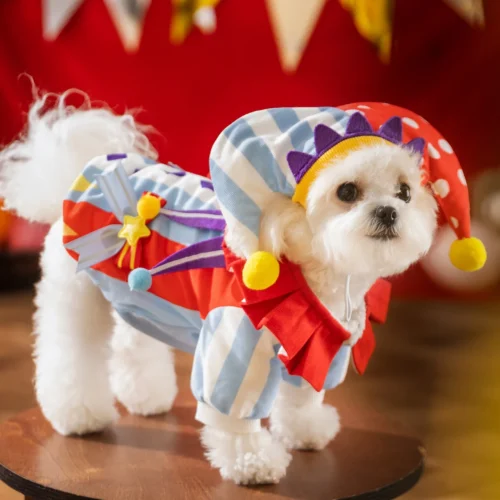 This is our vibrant clown dog costume. It features a colorful blue and white striped outfit with a large red bow, bright pom-poms, festive gift-box details on the back, and a playful jester hat with purple accents and yellow pom-poms. We can customize these styles to fit your dog’s exact measurements, change the colors, or add any special design touches you’d like.