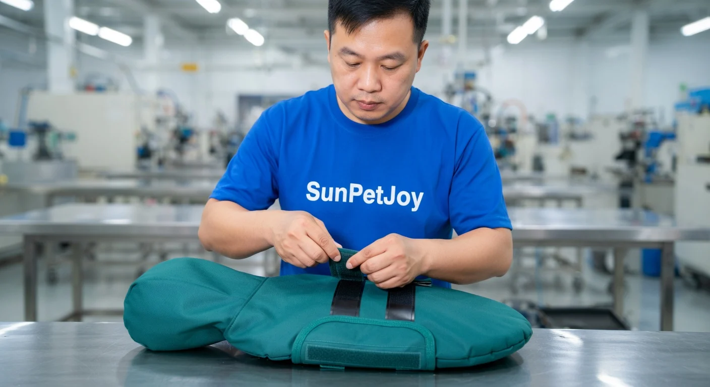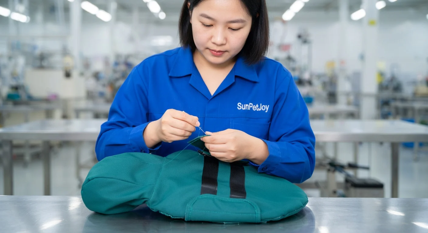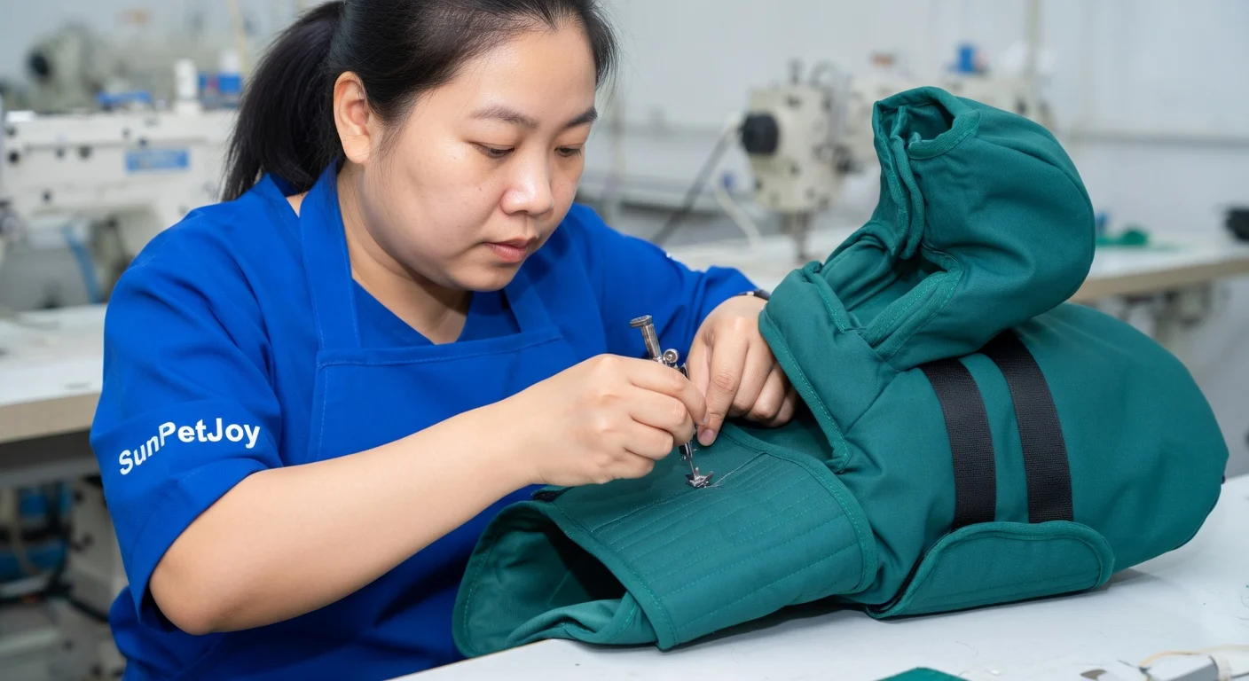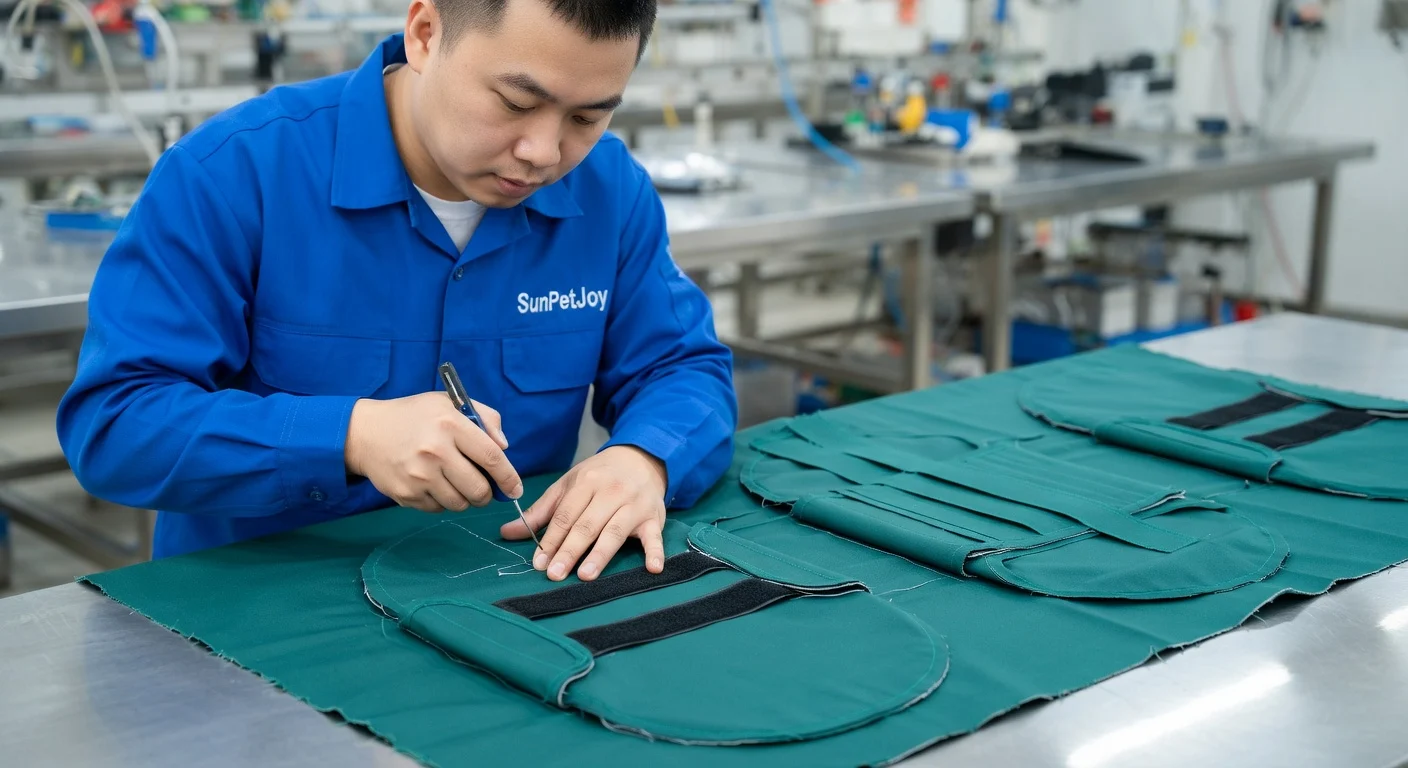 This is our final seam reinforcement and edge finishing during dog anxiety vest assembly, maintaining superior craftsmanship and consistent quality for dependable wholesale reliability.