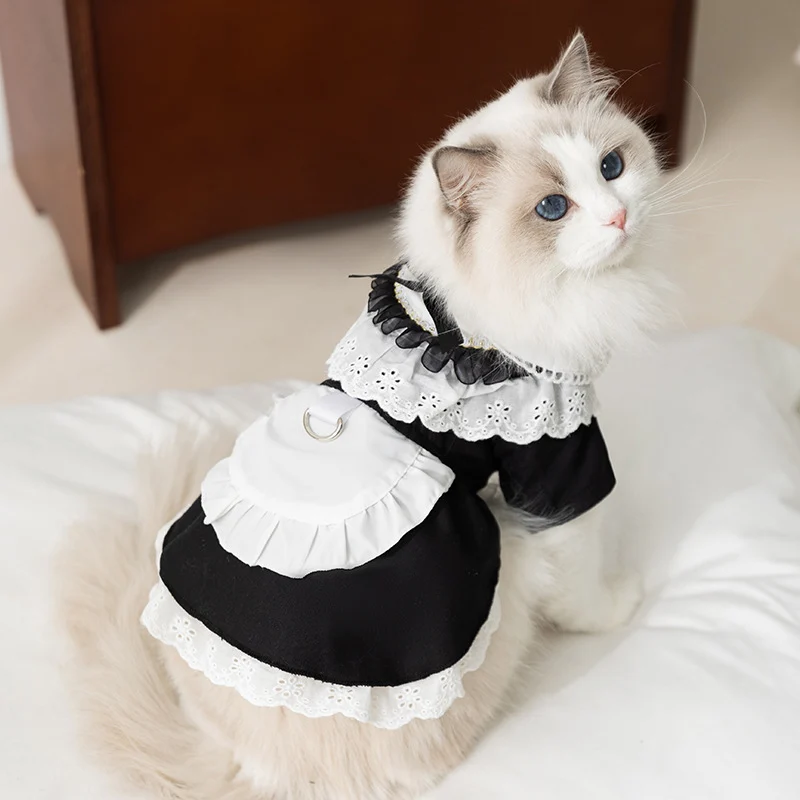 This is our custom cat maid dress, designed for brands and pet apparel buyers who want a charming and elegant style for the cat clothing market. It features a classic black-and-white color combination, soft fabric, lace trim, and a decorative apron detail that gives the outfit a very refined look. We can customize the fabric, collar style, lace pattern, skirt length, and accessory details to match your brand style or seasonal collection. This style is a great choice for pet boutiques, holiday collections, themed photo shoots, and fashion-focused petwear lines.