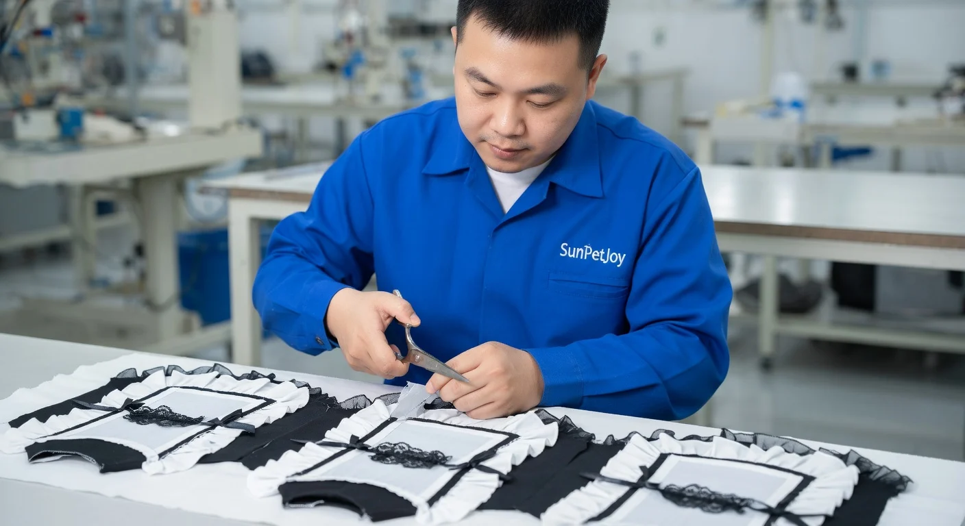 This is our detailed quality inspection and reinforcement at stress points on finished pet garments, guaranteeing consistent excellence and dependable performance for every wholesale batch.
