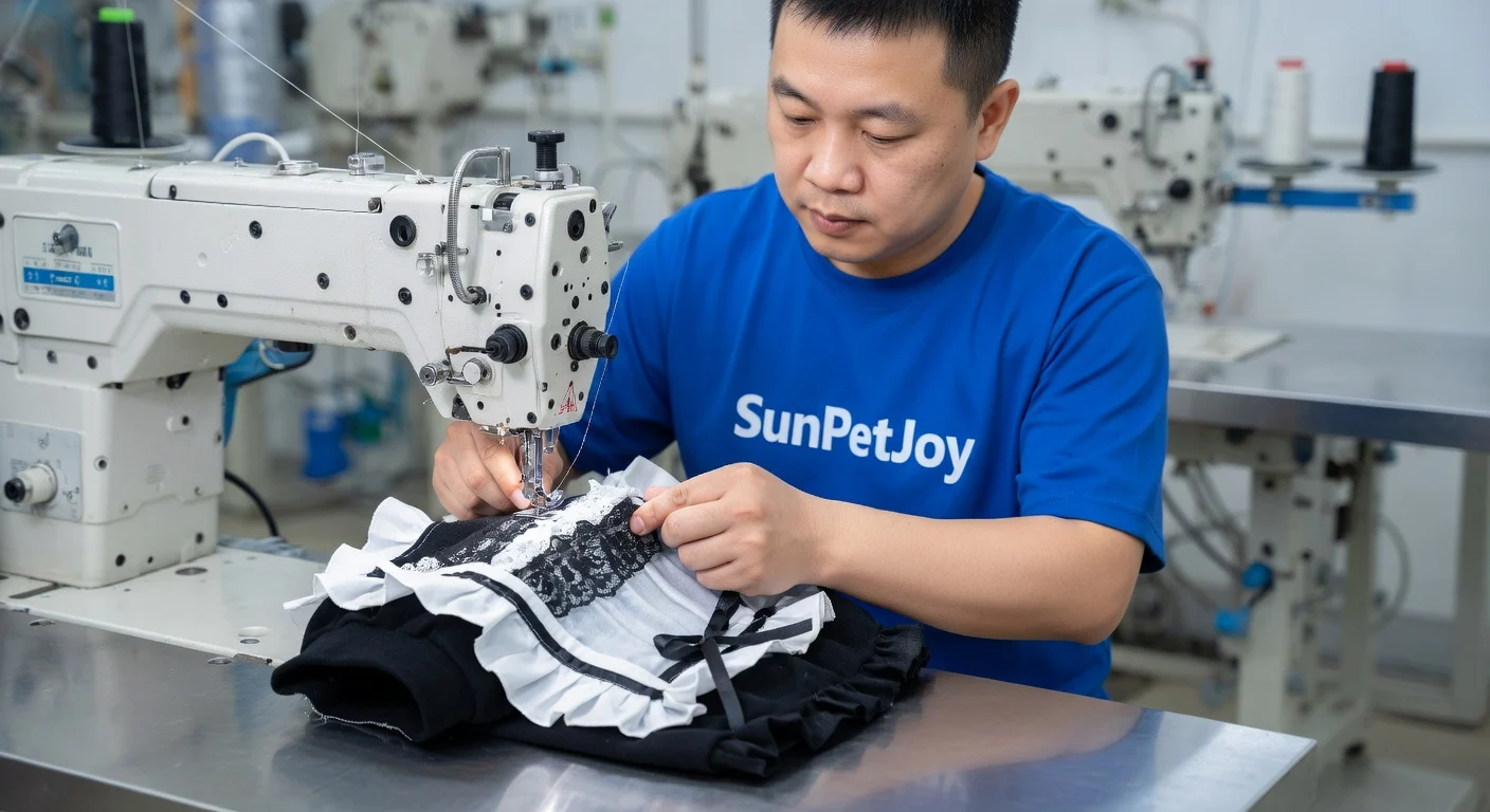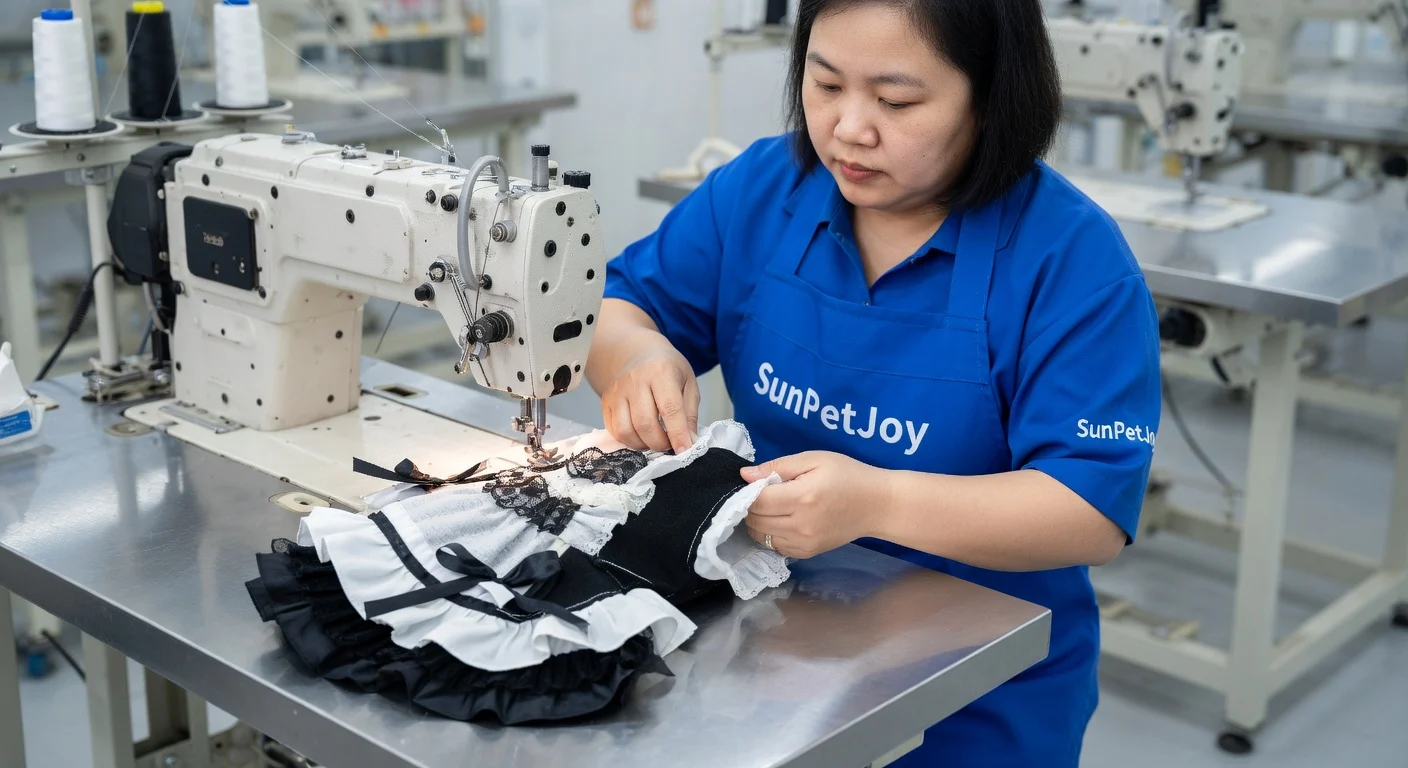 This is our expert sewing operation using industrial lockstitch machines to precisely join seams and attach sleeves on pet garments, delivering durable construction and quality control for bulk wholesale reliability.