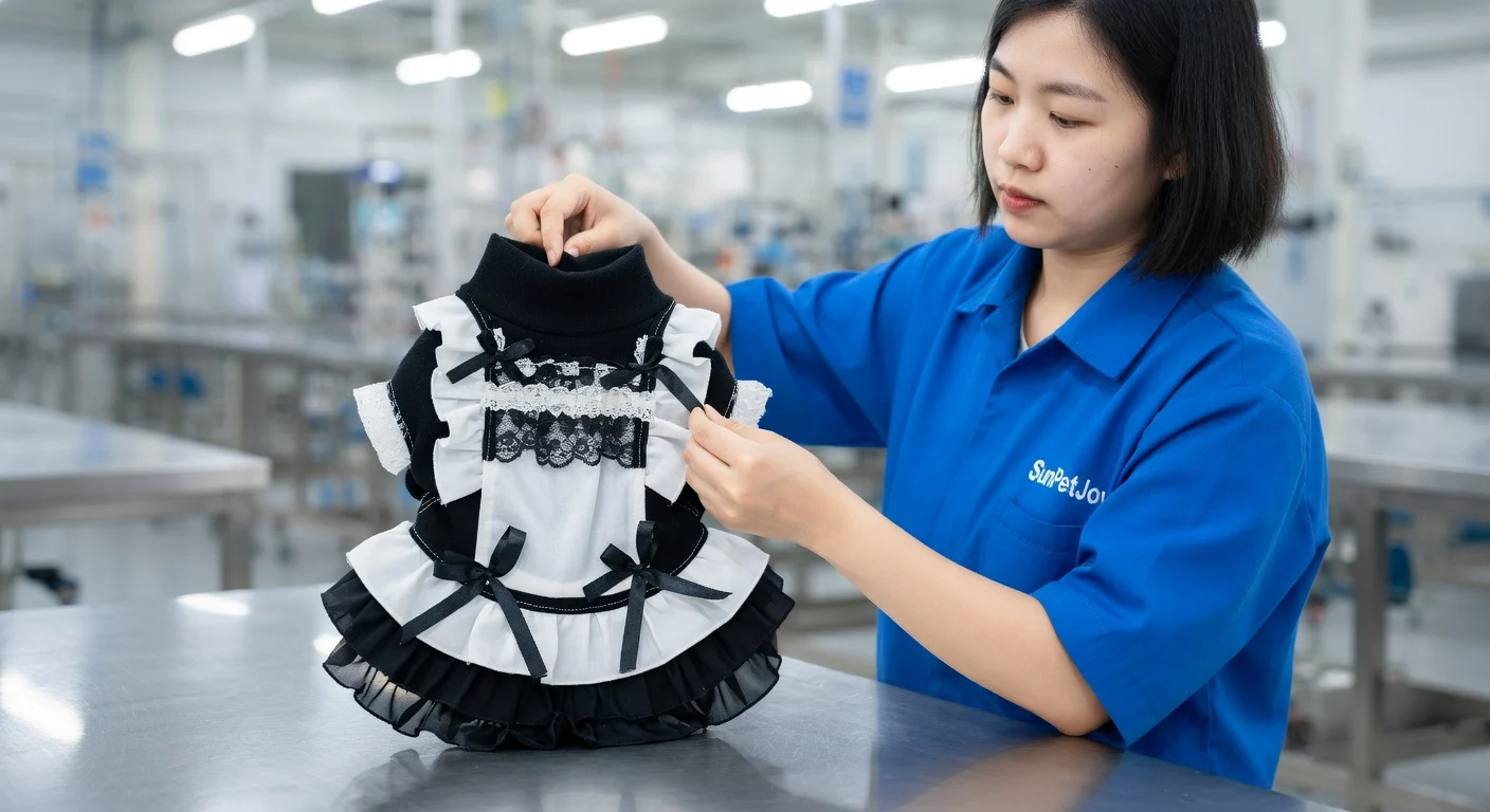 The production of the Black Cat Dress follows a structured sequence designed to ensure consistency across wholesale volumes. It commences with the careful selection of polyester fabric that meets requirements for flexibility and strength. Patterns are then precisely cut to align with exact size specifications for chest and back lengths. Industrial sewing machines, such as lockstitch and overlock models, join seams and finish edges, with adaptable equipment configurations that provide production flexibility. Lace trim and multi-layer ruffles are incorporated through specialized stitching steps to secure each component firmly. Reinforcement is added at critical stress points prior to final assembly. Every garment undergoes multiple inspection stages to confirm seam integrity, alignment, and overall construction quality. The process concludes with controlled packaging. These methodical steps guarantee uniform quality in every batch, delivering wholesalers a dependable supply that minimizes variation risks and fosters long-term business partnerships through timely pet apparel delivery.