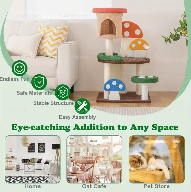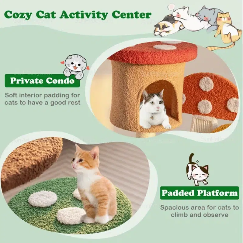 Discover the SUNPETJOY Mushroom Cat Tree — a fun, multi-level cat tower built for active cats. Soft teddy fabric, natural sisal posts, cozy condo, plush platforms, and spring-loaded ball deliver endless play. Perfect for B2B buyers looking for wholesale mushroom cat tree or OEM customization.