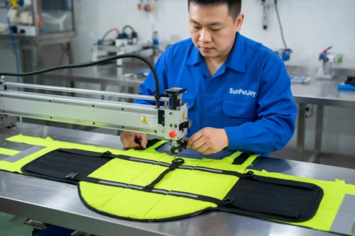 This is our specialized attachment stage where attentive technicians secure reflective strips and adjustable buckle straps with fixtures on the small-sized dog life vest, maintaining precision alignment and dependable quality for bulk orders.