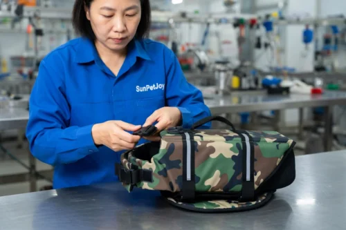 This is our final assembly process where meticulous specialists integrate custom velcro closures and plastic buckles on the camo dog life vest, upholding strict quality inspection and product reliability for consistent wholesale supply.