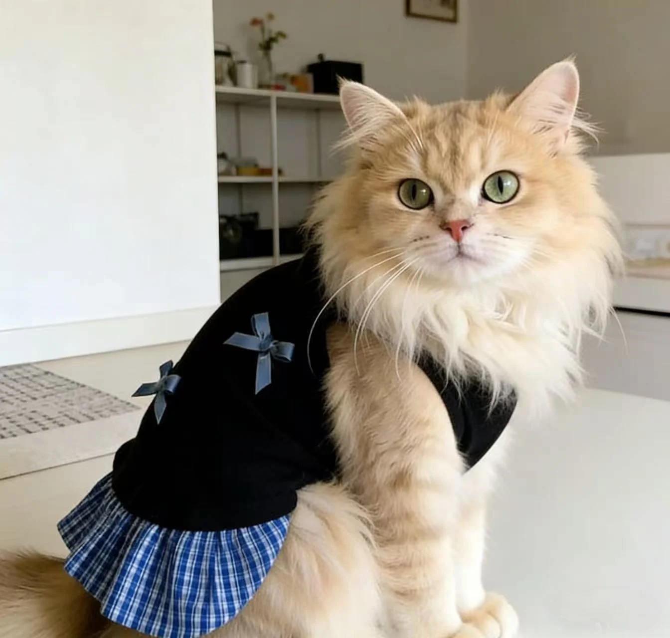 This is our custom cat dress with a classic dark top and blue plaid skirt, created for customers who want a stylish and slightly preppy look in their pet clothing line. It features delicate bow details, a comfortable fit, and a skirt design that makes the whole outfit look playful and eye-catching. We can customize the fabric, color matching, bow decoration, skirt pattern, and sizing details based on your design needs. This style works very well for cat fashion collections, boutique petwear, and custom seasonal styles with a charming and modern feel.