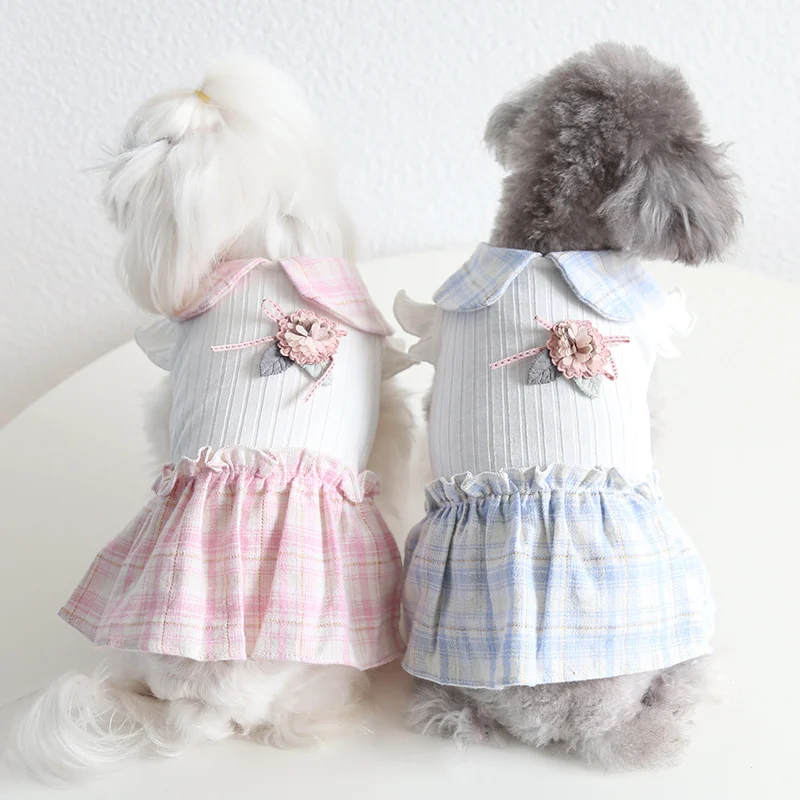 This is our custom pet plaid dress, designed with a soft ribbed top, a sweet check-pattern skirt, and a decorative flower detail on the back for a gentle and elegant look. We can customize the color combinations, plaid fabric, collar shape, flower decoration, and overall dress structure to match different brand styles and seasonal collections. This style is a lovely option for pet boutiques, spring and summer collections, and customers who want a soft, cute, and refined pet fashion design.