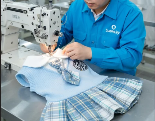 The manufacturing process for the cat dress for cats begins with the selection of polyester yarn, followed by production of the base fabric using melt spinning through extruders and spinnerets to form consistent fibers. These fibers are then processed on knitting equipment to achieve the ribbed texture required for the sweater portion. Subsequently, the process moves to precise pattern cutting, assembly of pleated plaid skirts and sailor collars on industrial sewing stations, application of embroidered patches via specialized embroidery setups, and comprehensive quality verification at multiple stages prior to final packaging. This ensures a smooth, uninterrupted sequence that maintains production flexibility across batch volumes through multiple equipment configurations and processing methods.