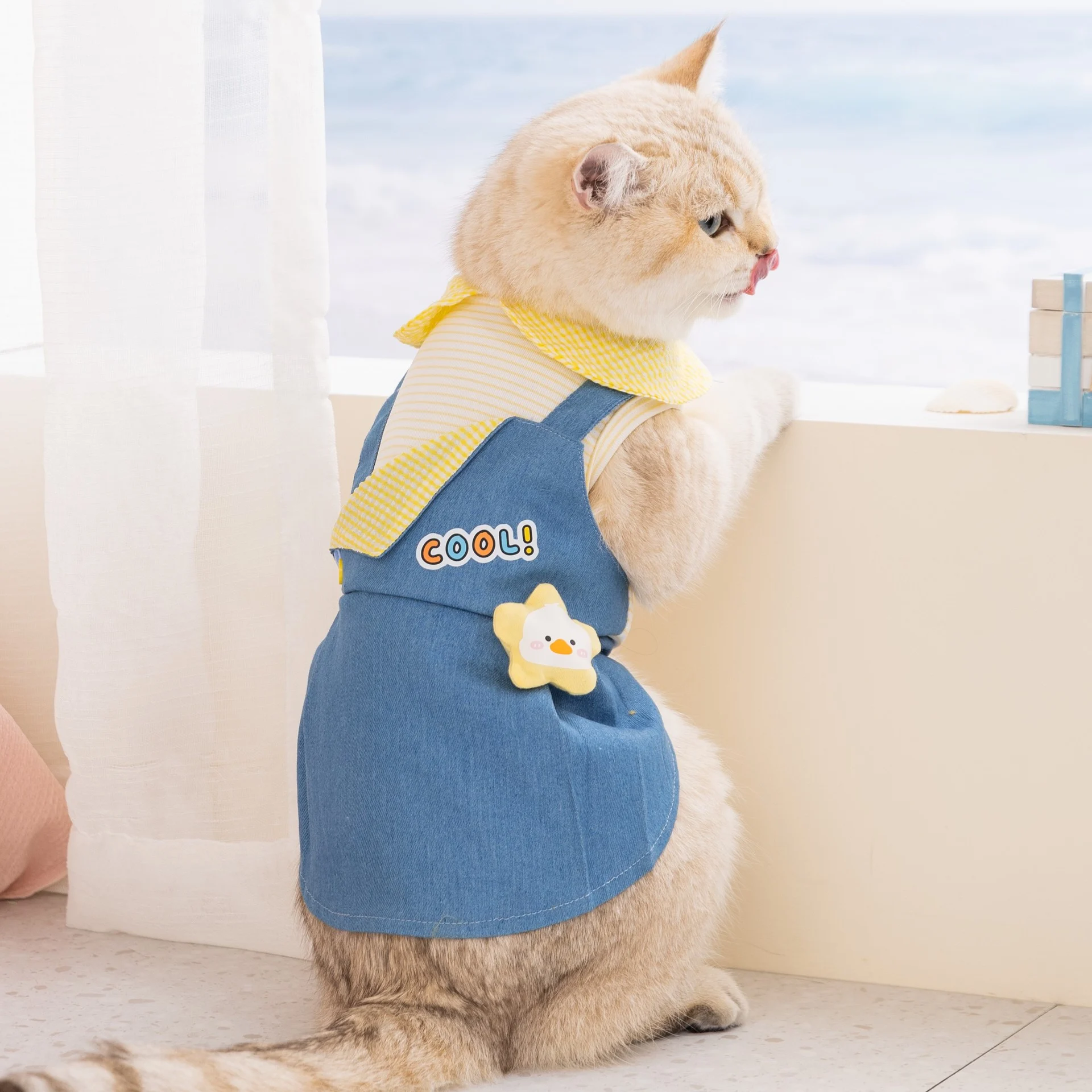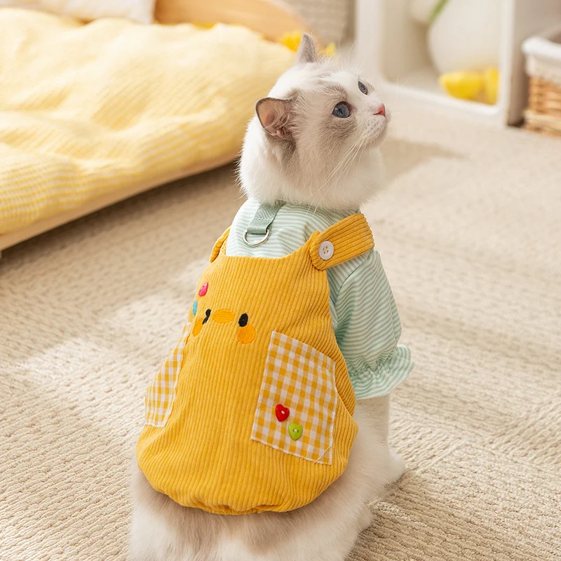 This is our custom cat suspender dress, designed with a fresh yellow-and-blue color combination that gives the whole style a playful and youthful look. It features a striped inner layer, a contrast collar, denim-style outer dress, and cute decorative details that make it more eye-catching for spring and summer pet fashion collections. We can customize the fabric, color matching, printed elements, accessories, and overall dress structure to fit different brand themes and market preferences.