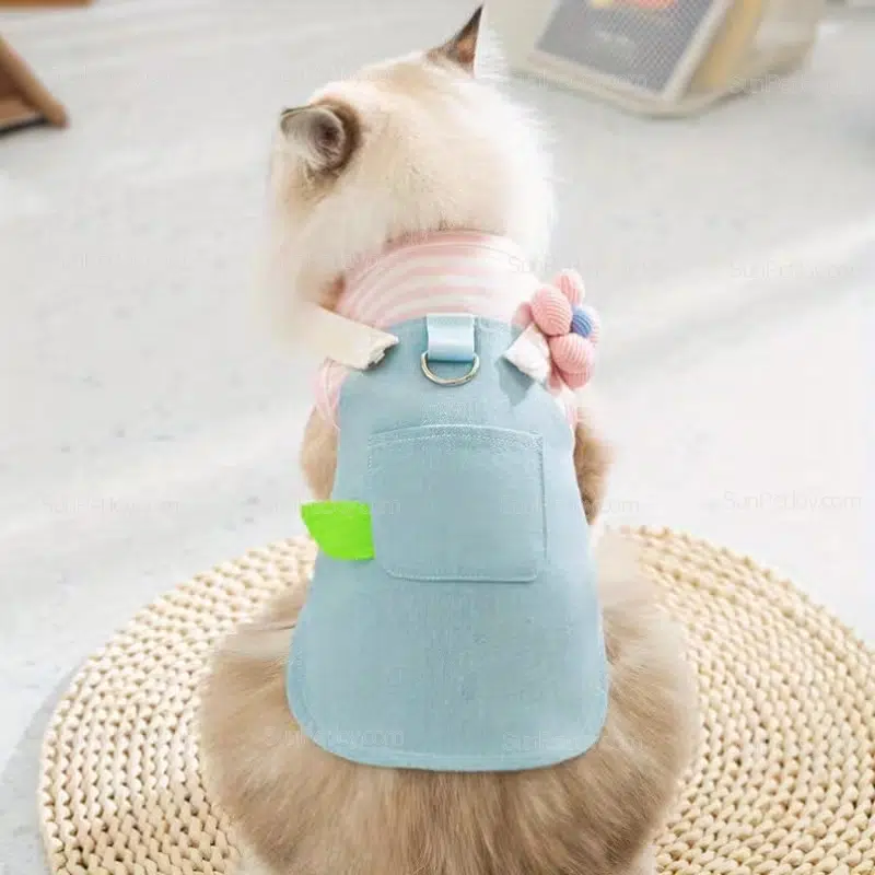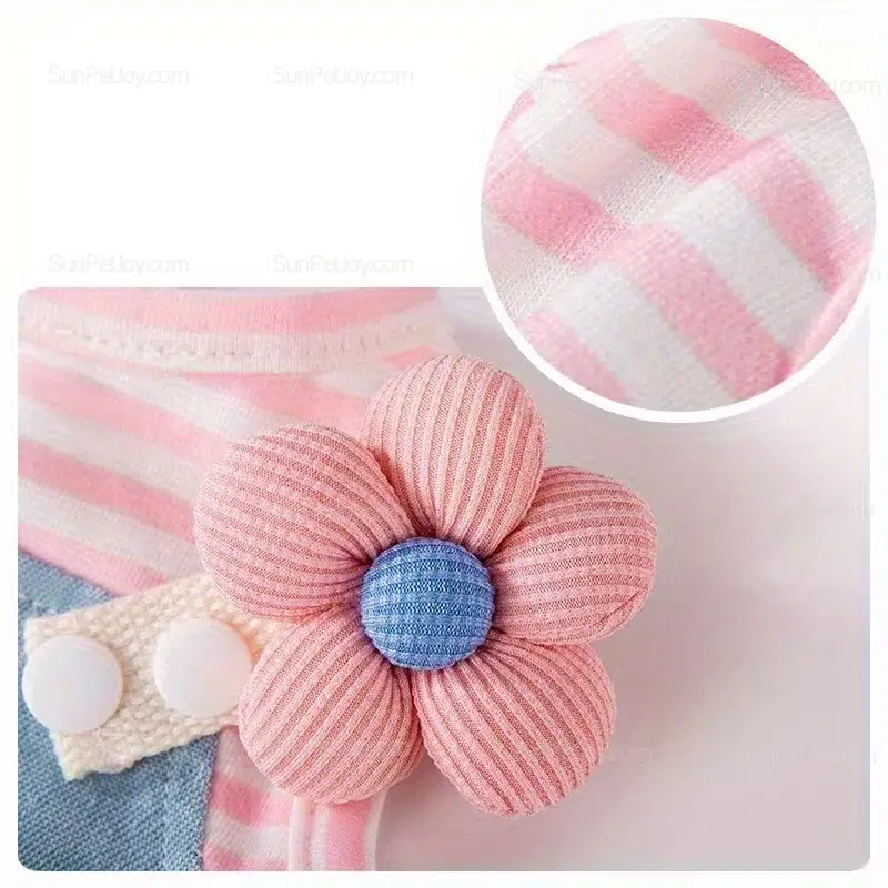 The cat dress is a striped denim paneled pullover sundress constructed with a pink striped upper and blue denim lower section that includes a front pocket, three-dimensional flower accent, green leaf patch, and metal D-ring for leash attachment. This design serves wholesalers, pet retailers, e-commerce sellers, and brand developers seeking reliable pet apparel for cats and small dogs. The construction supports commercial value through consistent sizing that reduces fitting issues in retail sales, enables efficient bulk inventory management with faster turnover, and delivers functional wear that pet owners can rely on for daily activities while providing pets with a garment that accommodates movement without restriction.