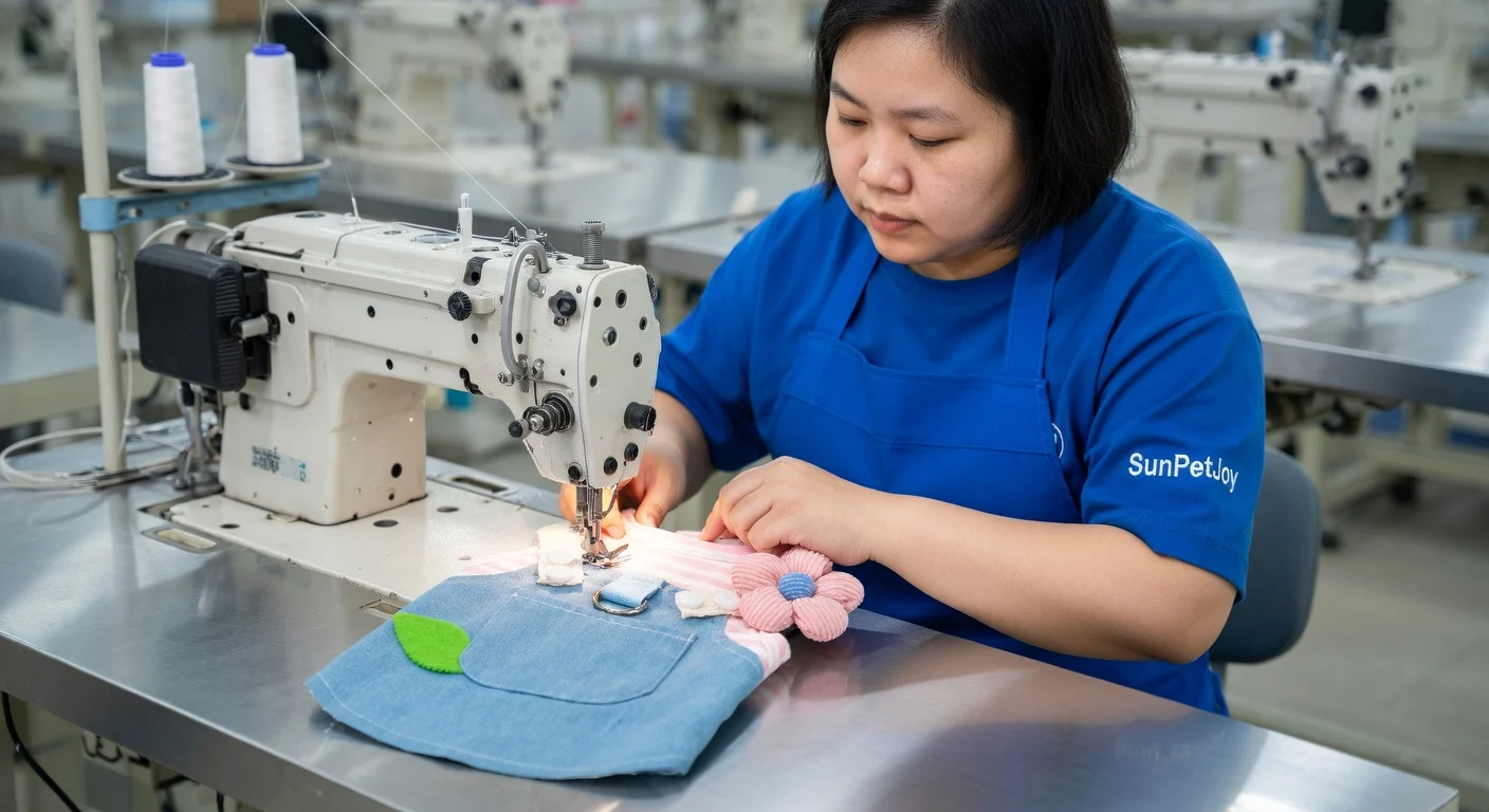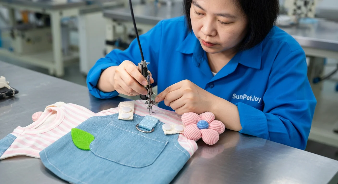 This is our accessory attachment process where experts use bartack and decorative stitching to secure the metal D-ring, straps, and floral applique on our cat dress, guaranteeing detailed precision and consistent quality for wholesale partners.