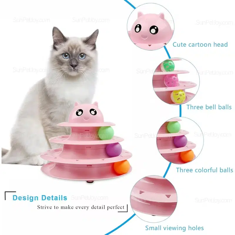 The multi-tier track structure encourages cats to bat, chase, and follow rolling balls,