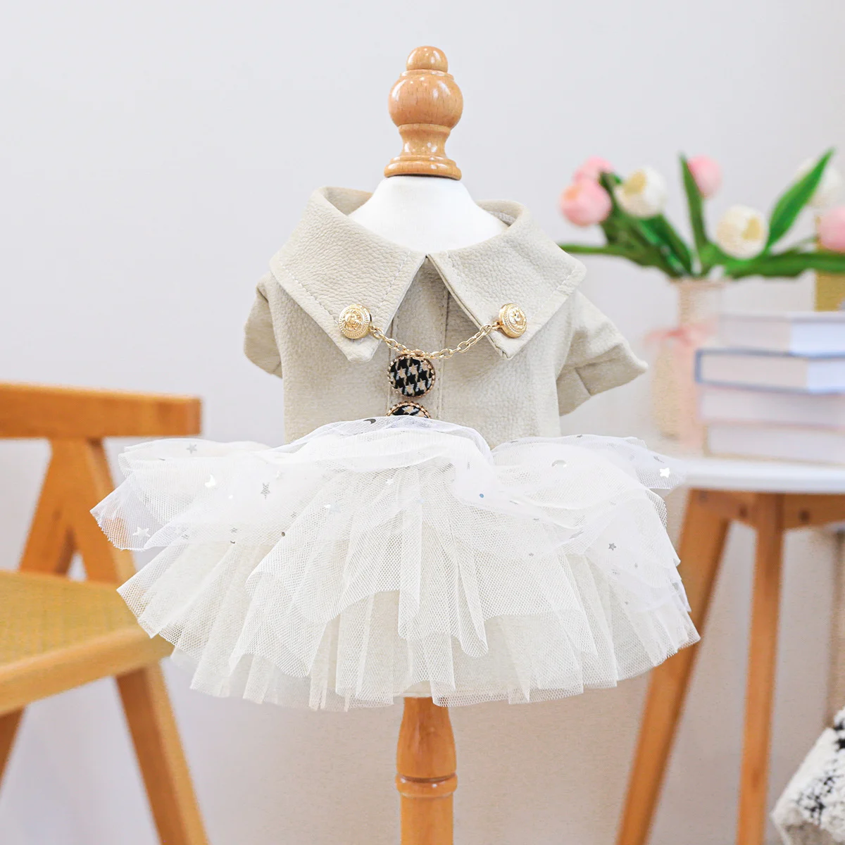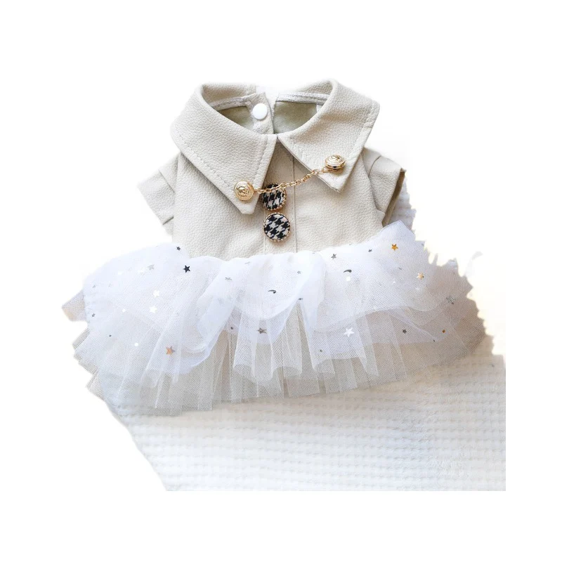 This cat skirt is a structured pet dress that combines a beige faux leather jacket with collar, gold chain, and houndstooth pendant details alongside a layered white tulle tutu with metallic embellishments. It is designed for small breed dogs and supports wholesale procurement by pet stores, online retailers, brand developers, and distributors seeking differentiated apparel lines. The construction delivers commercial value through reliable sizing that reduces fit-related returns for retailers, enables efficient inventory management for buyers, provides functional coverage and movement for pets, and offers pet owners a convenient dressing option that supports daily routines.