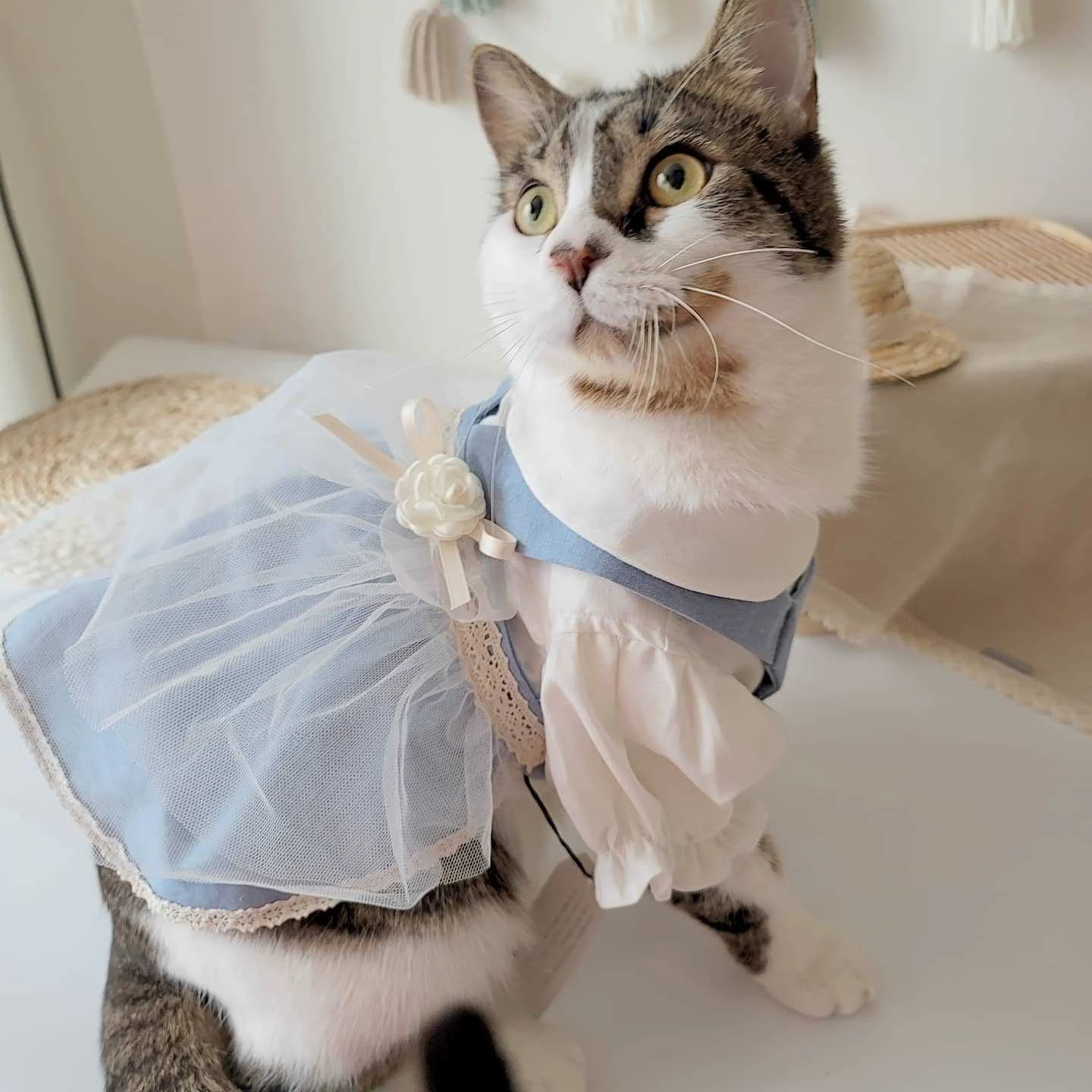This is our custom cat princess dress, created for customers who want a soft, sweet, and elegant style in their pet clothing collection. It features a light blue and white color combination, a neat collar design, puff sleeves, delicate lace trim, and a layered mesh skirt decorated with a flower bow for a more charming and premium look. We can customize the color matching, fabric, lace details, bow decoration, skirt layers, and overall dress style based on your brand needs. This style is very suitable for pet boutiques, seasonal collections, party wear, and cat fashion lines that want a gentle and eye-catching design.