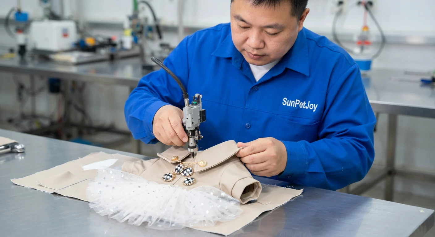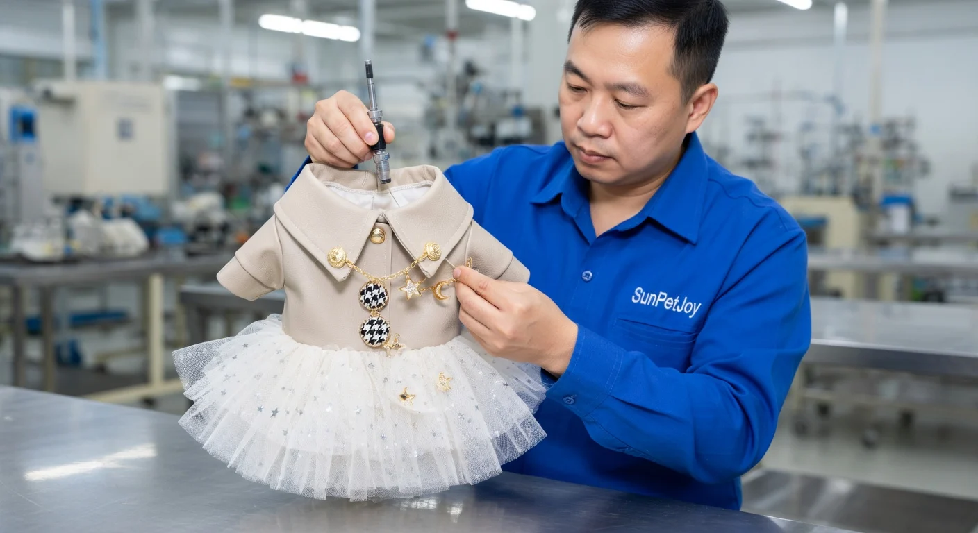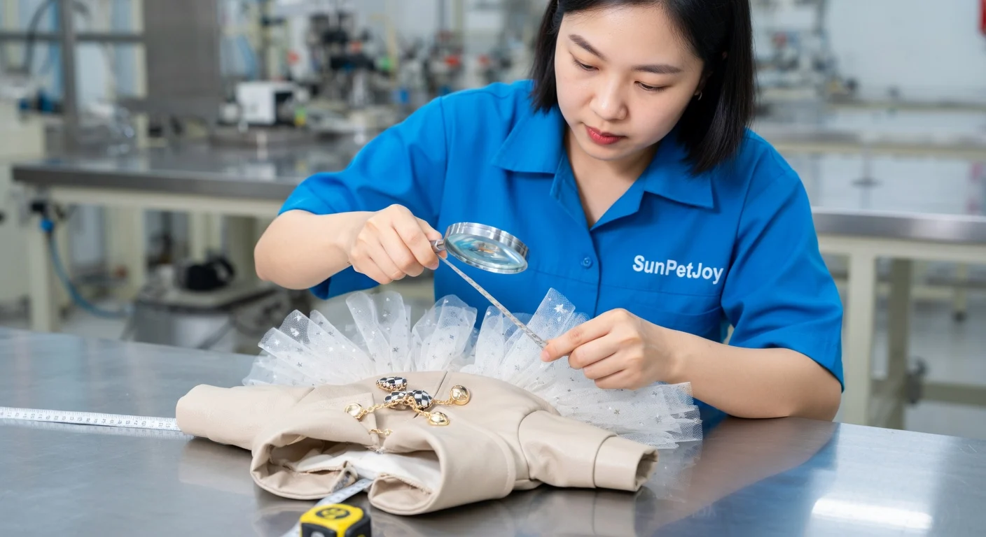 This is our detailed quality control inspection where stitching alignment, measurements, and finish are verified on each finished pet garment. This final step upholds uncompromising standards and supply consistency for wholesale partners.