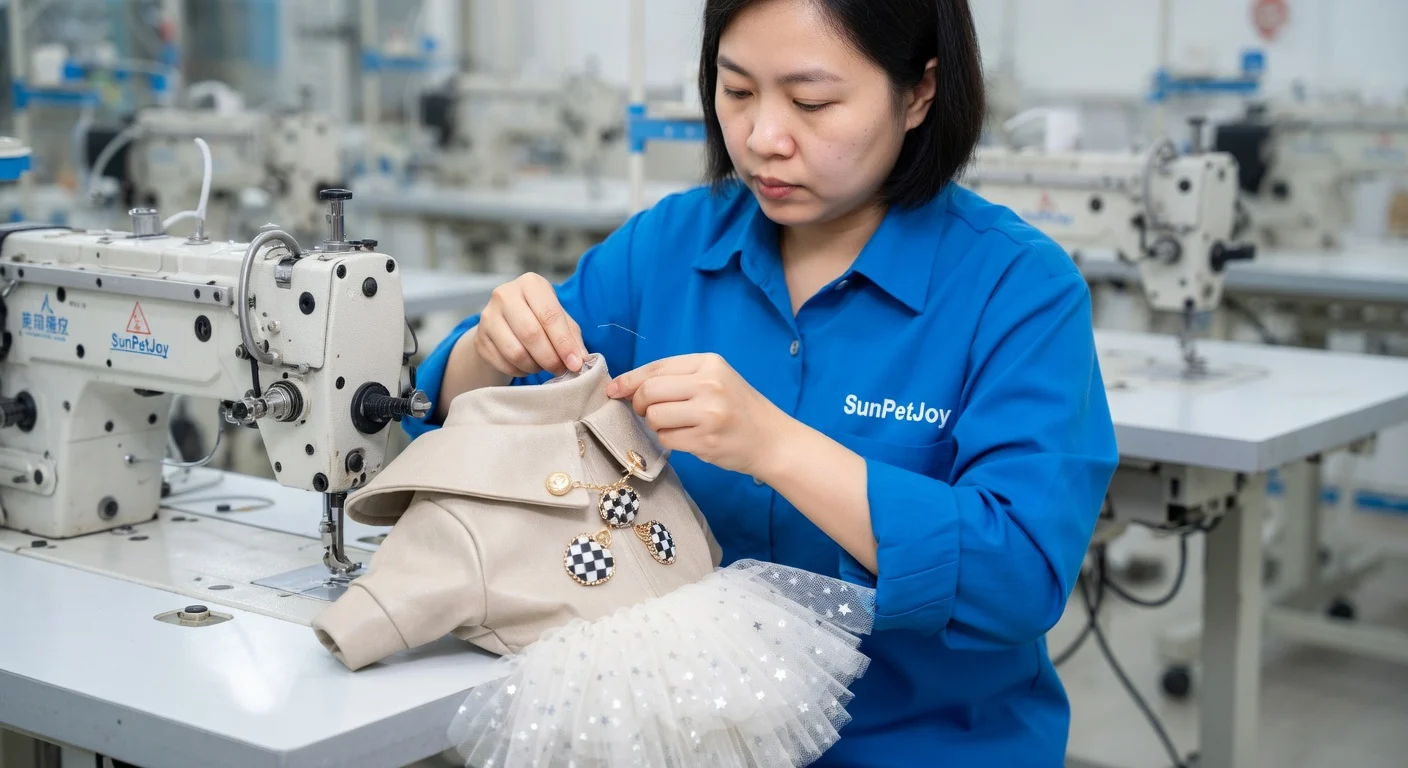 This is our industrial sewing process where the jacket body and reinforced high collar are assembled with durable stitching on our pet dresses. This delivers structural precision and long-term quality for wholesale reliability.