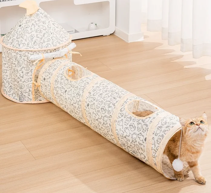 The cat tent with tunnel is made of polyester fabric featuring a 50cm high 40cm wide house-shaped entrance connected to a 100cm long tube with 24cm diameter, designed with multiple openings and interactive balls to support combined play and rest functions as a high value pet toy for wholesale.