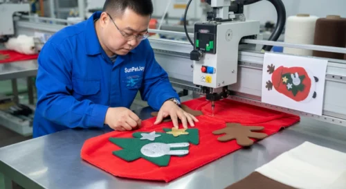 This is our industrial sewing stage where technicians precisely attach 3D reindeer antlers and Christmas appliques to the red fleece body, maintaining alignment and quality control for consistent wholesale reliability.