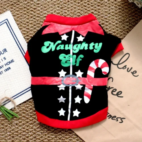 This is our Christmas-themed dog shirt with a naughty elf design, made with a fun black-and-red color combination, festive graphic details, and a soft casual fit that gives dogs a playful holiday look. We can customize this style with different Christmas prints, colors, slogans, fabric materials, and sizes to fit your seasonal collection and brand needs.