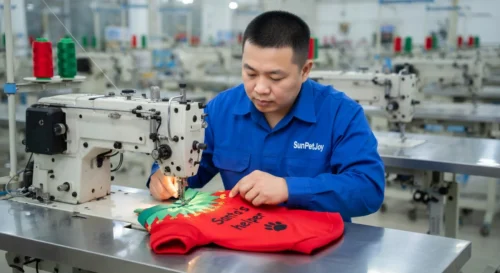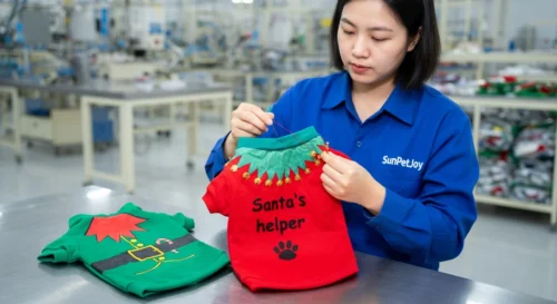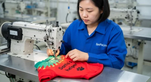 This is our meticulous assembly stage where artisans carefully attach golden jingle bells and printed details to the red Christmas dog shirts, maintaining precise standards for superior product consistency in bulk orders.