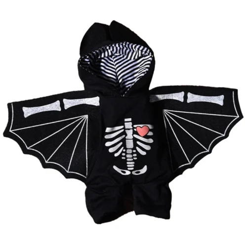 This is our black bat skeleton dog costume. It features a hooded design with prominent bat wings incorporating detailed bone motifs, a skeleton ribcage print on the chest accented by a red heart, and an interior striped lining within the hood. We can customize these styles to accommodate your dog’s specific measurements, preferred colors, or additional design modifications.