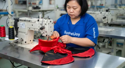 This is our expert sewing stage where our team uses industrial machines to form and attach the fan-shaped bat wing collar on each dog cape, maintaining superior precision and quality control for bulk orders.