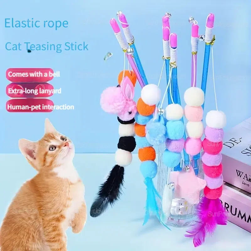 The design combines a lightweight plastic rod, elastic rope control, and interchangeable feather and pom attachments, making it suitable for private label programs and multi-SKU expansion.