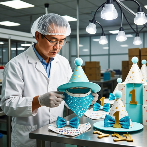 This is our employee carefully inspecting the polyester fabric, glitter bow materials, printed birthday bandana panels, hat components, and gold number accessories before production begins, making sure each material meets our requirements for color consistency, surface cleanliness, print clarity, and overall assembly compatibility, so the finished dog birthday set can maintain a more consistent look and quality across bulk orders.