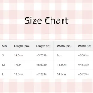 | Size | Length (cm) | Length (in) | Width (cm) | Width (in) |