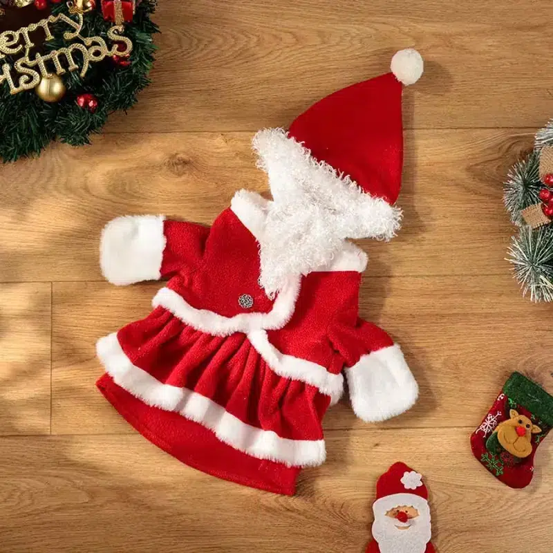 Classic red Santa dress with attached hood, faux beard, and pom-pom hat. Plush white trim on cuffs, hem, and collar. Velcro closure for easy fit. Non-electric, machine-washable. Keeps small-medium dogs warm and photo-ready for Christmas promotions.