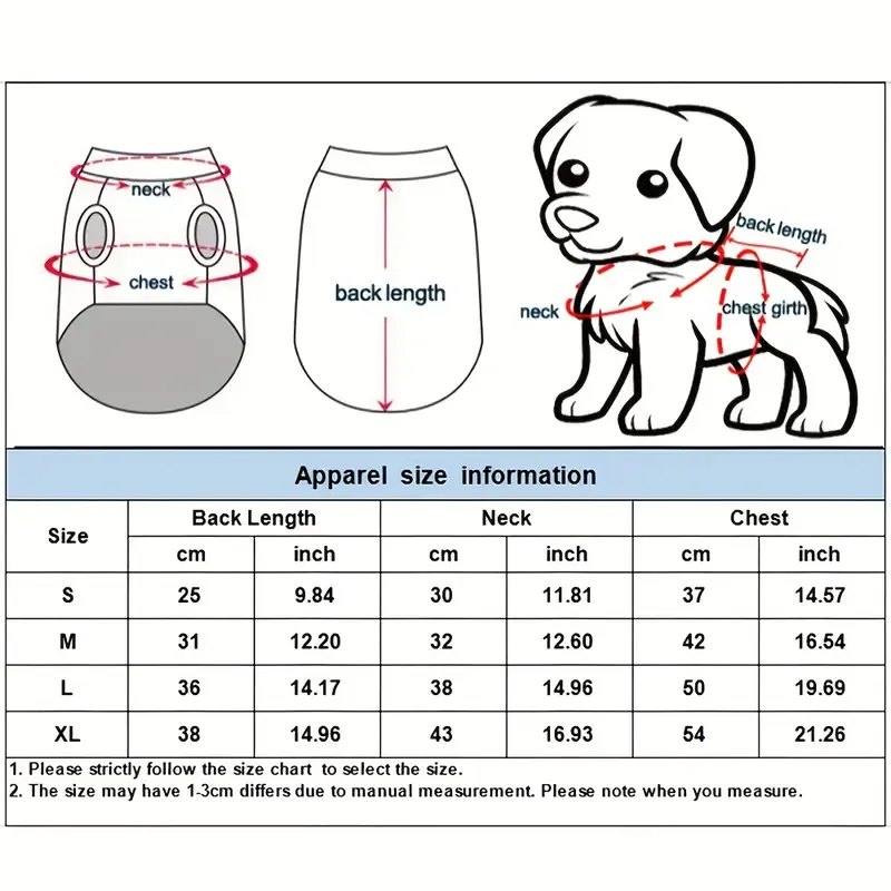 | Size | Back Length (cm/inch) | Neck (cm/inch) | Chest (cm/inch) |