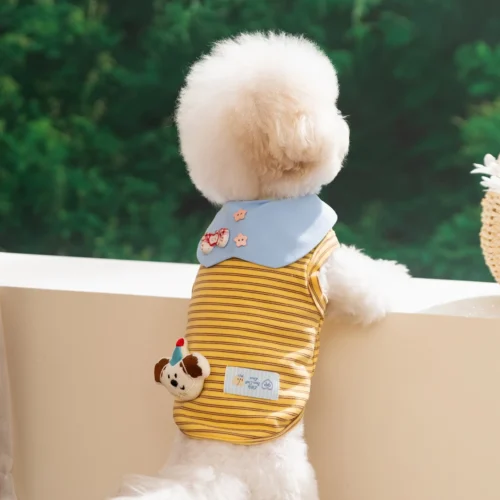 This is our cute striped dog shirt, designed with a soft yellow striped body, a large contrast collar, and playful decorative details that give dogs a sweet and cheerful everyday look. We can customize this style with different stripe patterns, collar shapes, applique decorations, labels, colors, and sizes to match your brand and customer preferences.