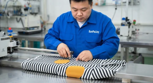 This is our specialized patching process where we carefully attach contrasting elbow patches to our custom dog shirts using precision sewing machines, delivering reinforced durability and uniform quality across all batches.