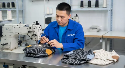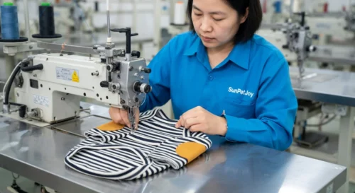 This is our expert assembly stage at the sewing station where our team precisely joins body and sleeve components of each custom dog shirt, maintaining strict quality control for consistent wholesale production.
