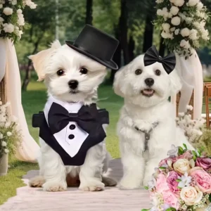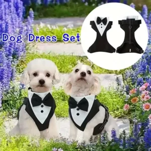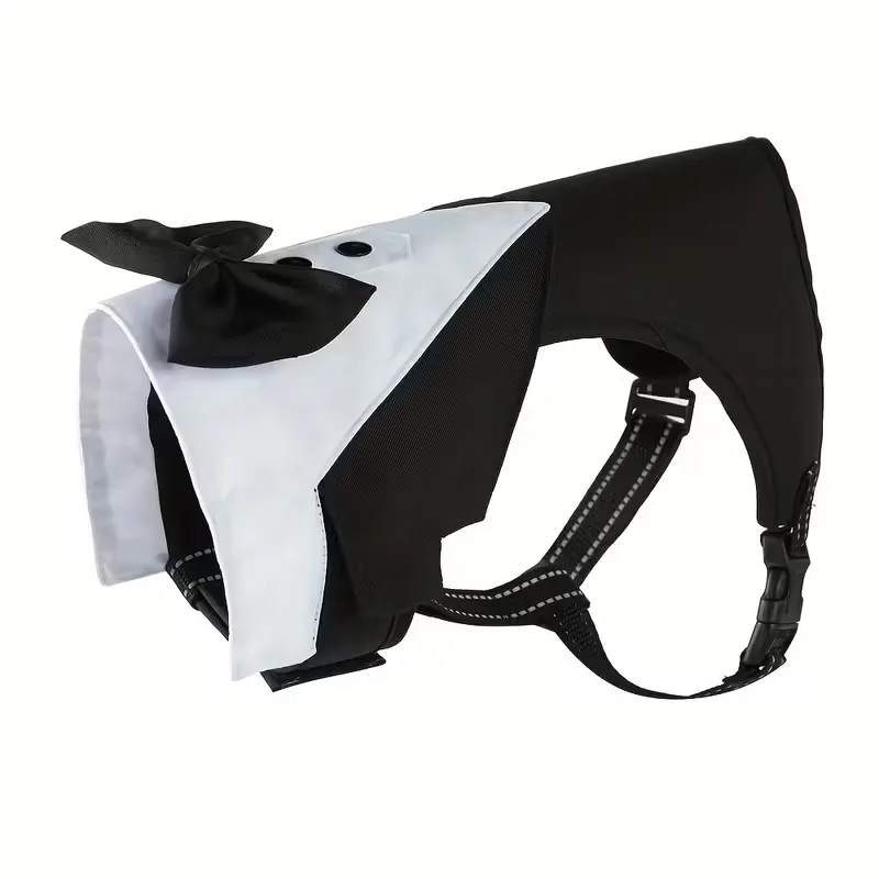 SUN PET Tuxedo Bow Tie Dog Harness – Premium wholesale dog ties for B2B bulk supply. 100% woven polyester mesh with reflective strips for safety. Pull-over harness with secure bow tie. OEM/custom dog ties wholesale: tailor sizes, colors, logos, packaging. Ideal for US distributors – weddings, events, photo props. Hand wash only, no battery.