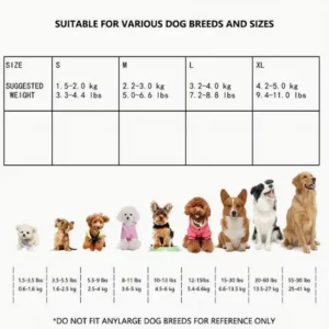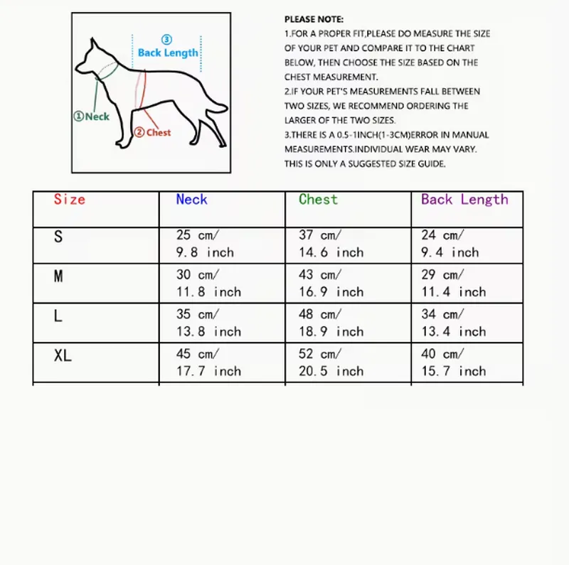 | Size | Neck | Chest | Back Length | Weight (kg/lbs) |