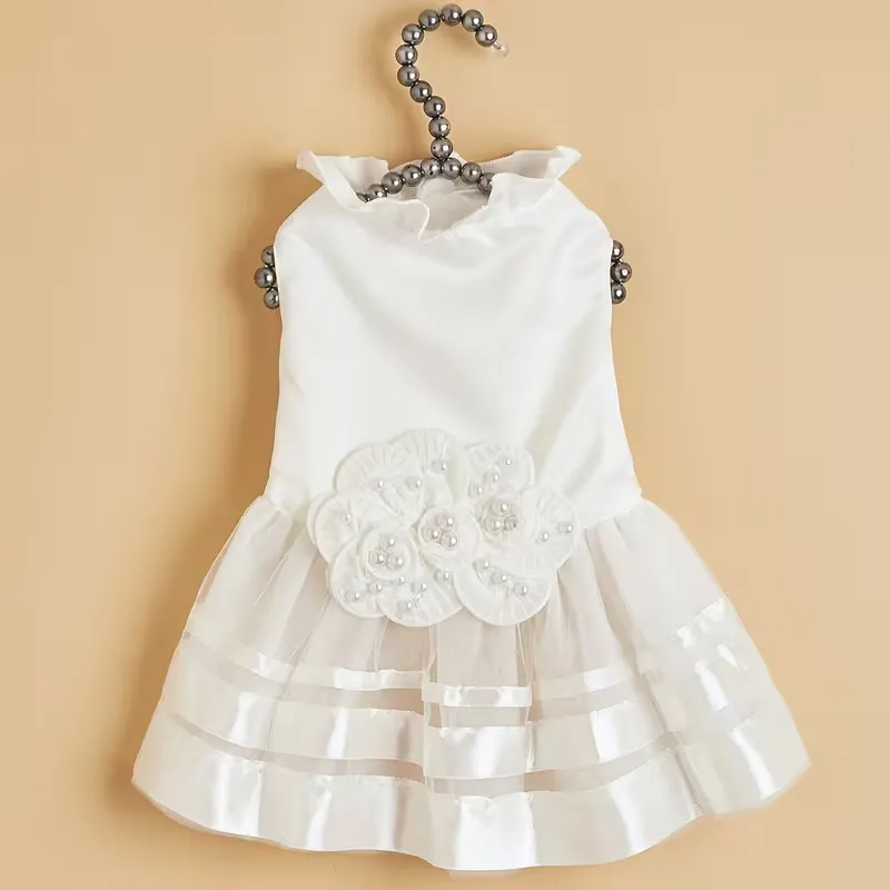 Elevate your pet boutique collection with SUN PET premium white pearl wedding dress. Handcrafted with elegant 3D floral appliques and multi-layer satin & tulle skirt, perfect for wedding events, photography studios and high-end pet stores. As a professional OEM pet apparel manufacturer, SUN PET supports full customization – logo embroidery, color matching, private labeling and custom sizes available. Low MOQ, fast production, competitive wholesale pricing.
