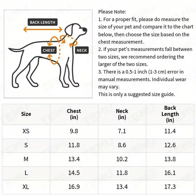 | Size | Chest | Neck | Back Length |