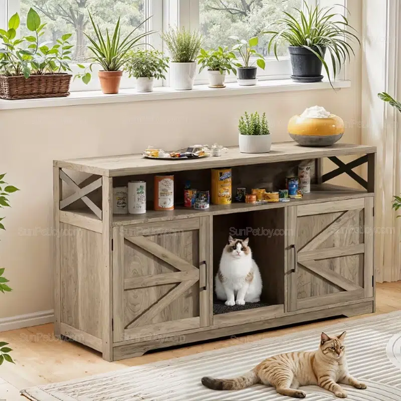 Introducing the SUNPETJOY Farmhouse Cat Litter Box Enclosure, a premium and customizable solution designed for wholesale buyers and retailers. This elegant piece of pet furniture provides a stylish and functional hideaway for two cats, perfect for modern homes or pet stores looking to offer high-quality, space-saving products.