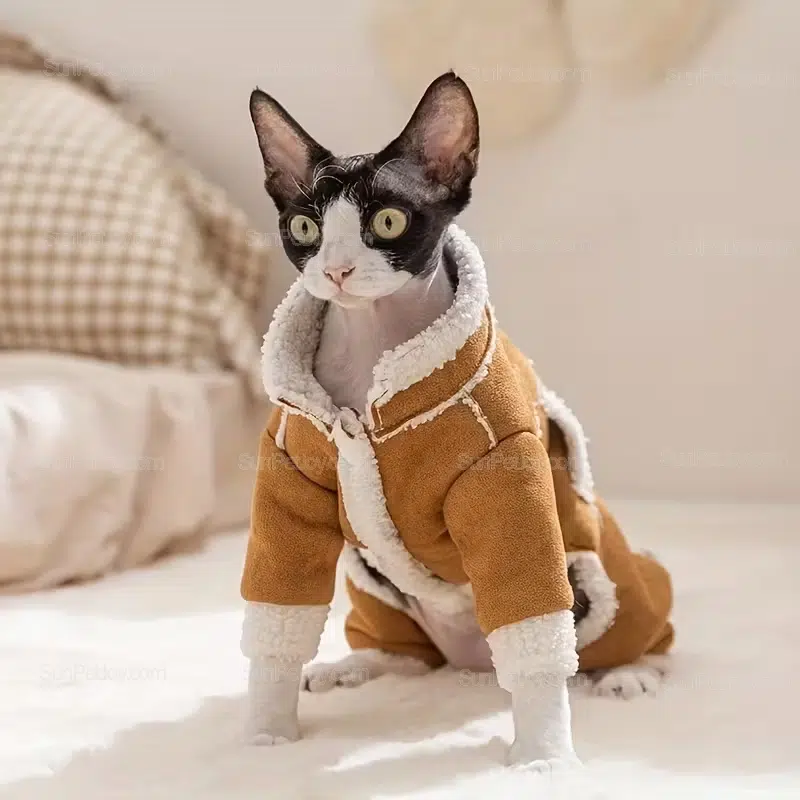 Discover our premium hairless cat winter jackets, crafted for Sphynx and Devon Rex breeds to combat chilly autumn and winter days. This four-legged padded coat features thick fleece lining for superior warmth, ensuring your feline clients stay cozy during indoor lounging or brief outdoor adventures.