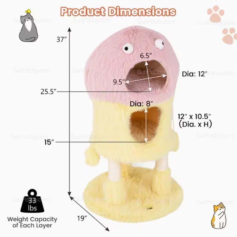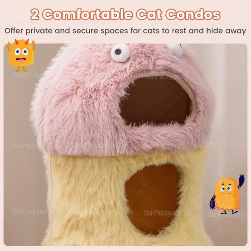Discover the SUNPETJOY Monster-Themed Cat Tree Tower, a whimsical plush haven that turns playtime into an adventure for indoor cats. Crafted with ultra-soft long plush fabric in pink and yellow, this 2-level activity center features cozy condos for hiding, sisal scratching posts for claw care, and dangling toys for endless fun. Perfect for B2B partners like pet retailers seeking reliable wholesale plush cat furniture.