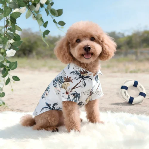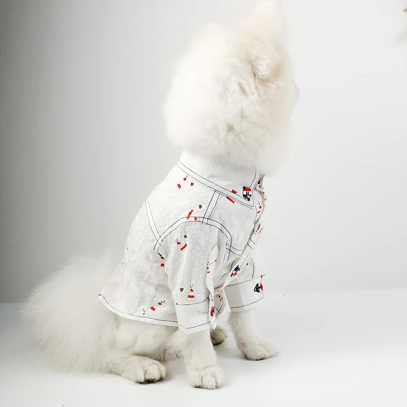 This is our Hawaiian-style printed dog shirt, made with a soft light-colored base, tropical plant and pineapple print, and a casual short-sleeve shape that makes dogs look playful and summer-ready. We can customize this style with different print themes, colors, logos, fabric materials, collar shapes, and size options for your wholesale or private label needs.