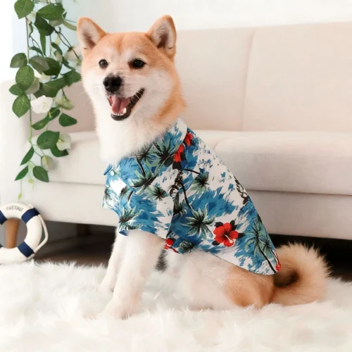 This is our tropical floral dog shirt, designed with a fresh blue-and-white print, classic button-up style, and lightweight feel that gives dogs a relaxed holiday look. We can customize this style with different floral patterns, colors, fabrics, button details, and sizes to match your brand and seasonal collection.