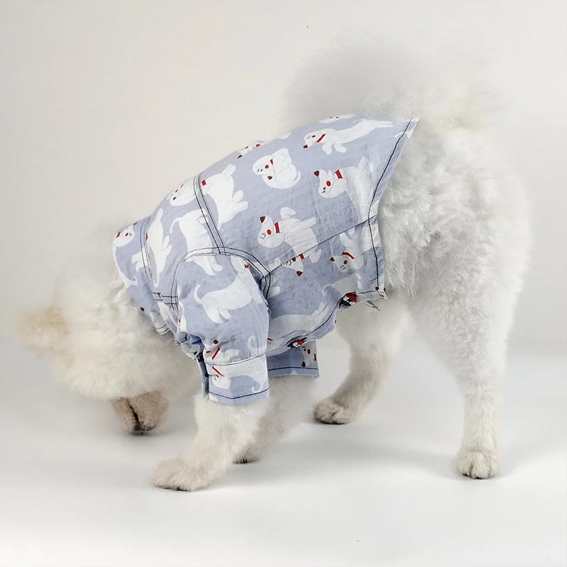 The custom printed dog shirt is a cotton garment with a blue cartoon dog pattern that incorporates a collar, cuffs, and button closure. It is produced in sizes ranging from XS to XL based on the provided measurements and is intended for wholesale procurement by pet apparel businesses, retailers, and brands seeking options for small dogs. This product supports business operations through consistent material selection and construction that align with standard pet apparel handling practices.
