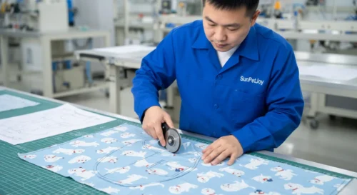 This is our precision fabric cutting process where skilled workers use rotary cutters to accurately shape cotton patterns for custom printed dog shirts, ensuring consistent sizing and superior quality for wholesale reliability.