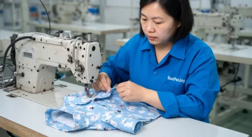 This is our expert sewing stage featuring reinforced seams on collars and cuffs of small dog garments using industrial machines, delivering exceptional durability and uniformity across all wholesale batches.