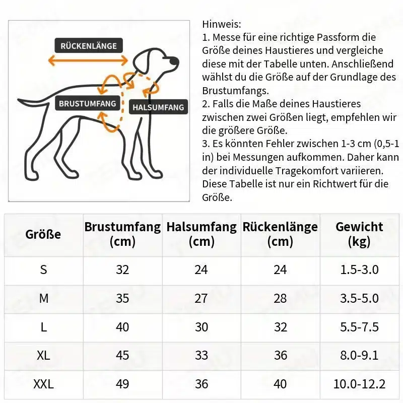 | Size | Chest (cm) | Neck (cm) | Back Length (cm) | Weight (kg) |