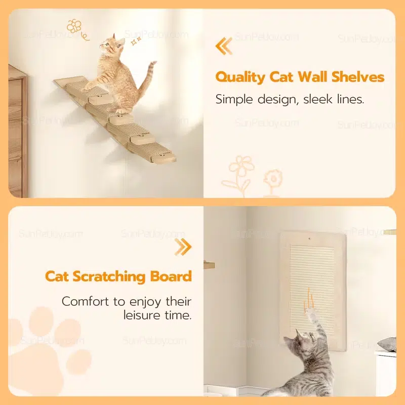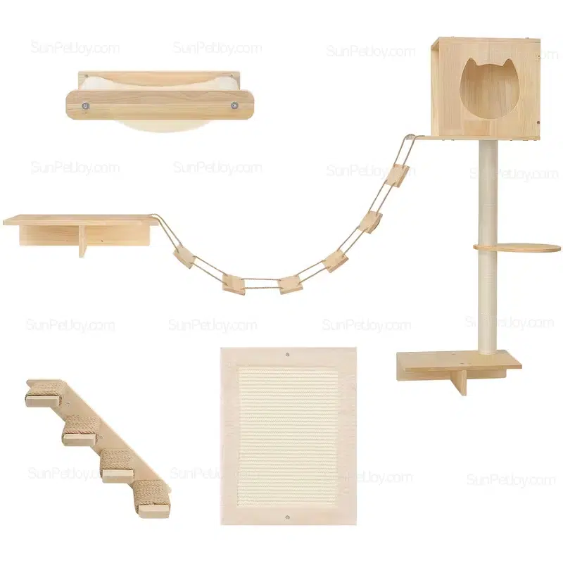 Discover the SUNPETJOY Wooden Cat Wall Shelves Set, a versatile 5-piece collection designed for feline fun and fitness. This wall-mounted cat furniture transforms any space into an engaging playground, featuring a cozy cat house, sturdy climbing shelves, a playful corridor bridge, plush hammock, and durable scratching board—all crafted from natural wood for safety and longevity.
